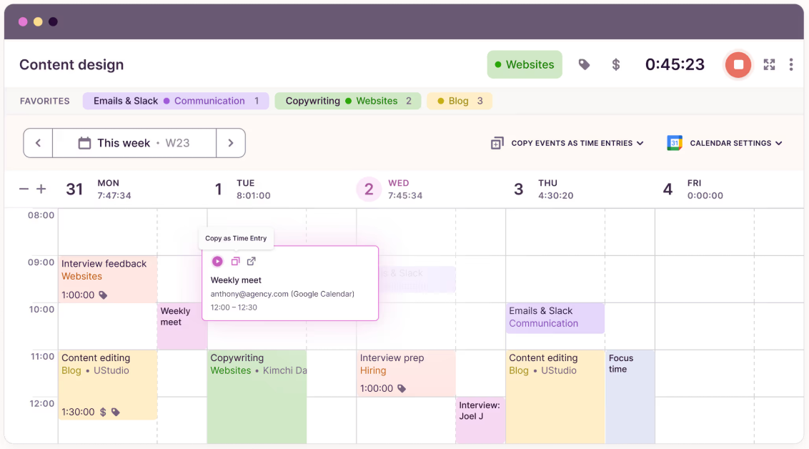 - Enables manual time logging and conversion of calendar events to time entries.